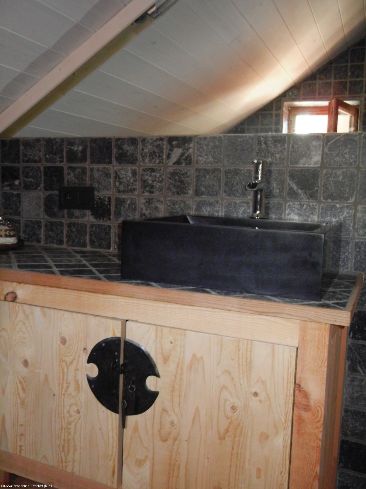 De keuken geeft uit op een overdekte terras met uitzicht over de bossen en de rivier. Naast de keuken is er een berging met de cv installatie op gas en een elektrische boiler met zonnepanelen . Er zijn 3 bemeubelde slaapkamers met elk een eigen sanitaire ruimte ttz lavabo , douche en toilet en uitzicht op de vallei .