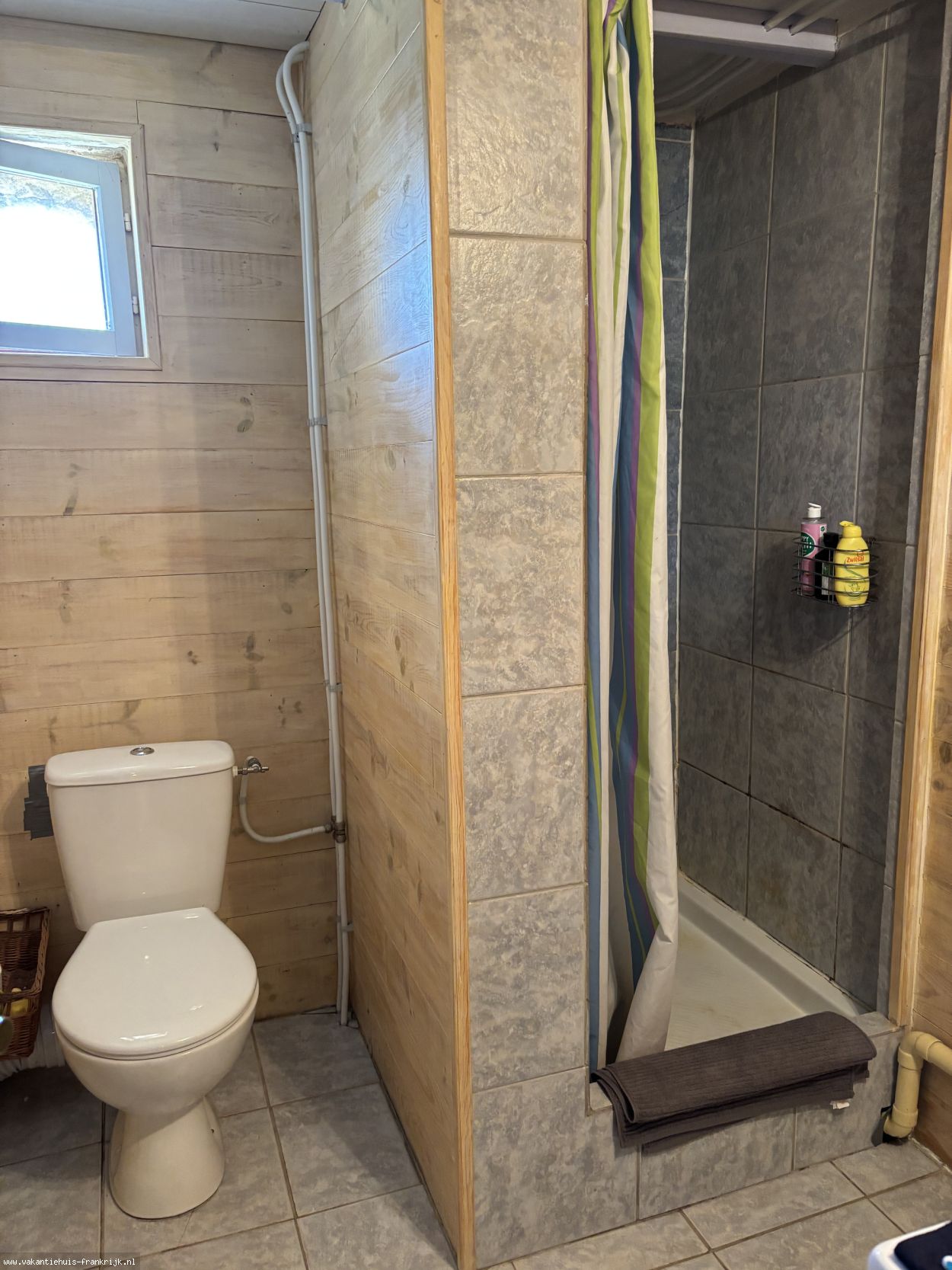 badkamer met douche, wastafel en toilet. De bovenverdieping wordt verwarmd met elektrische kachels. De zolder beslaat de