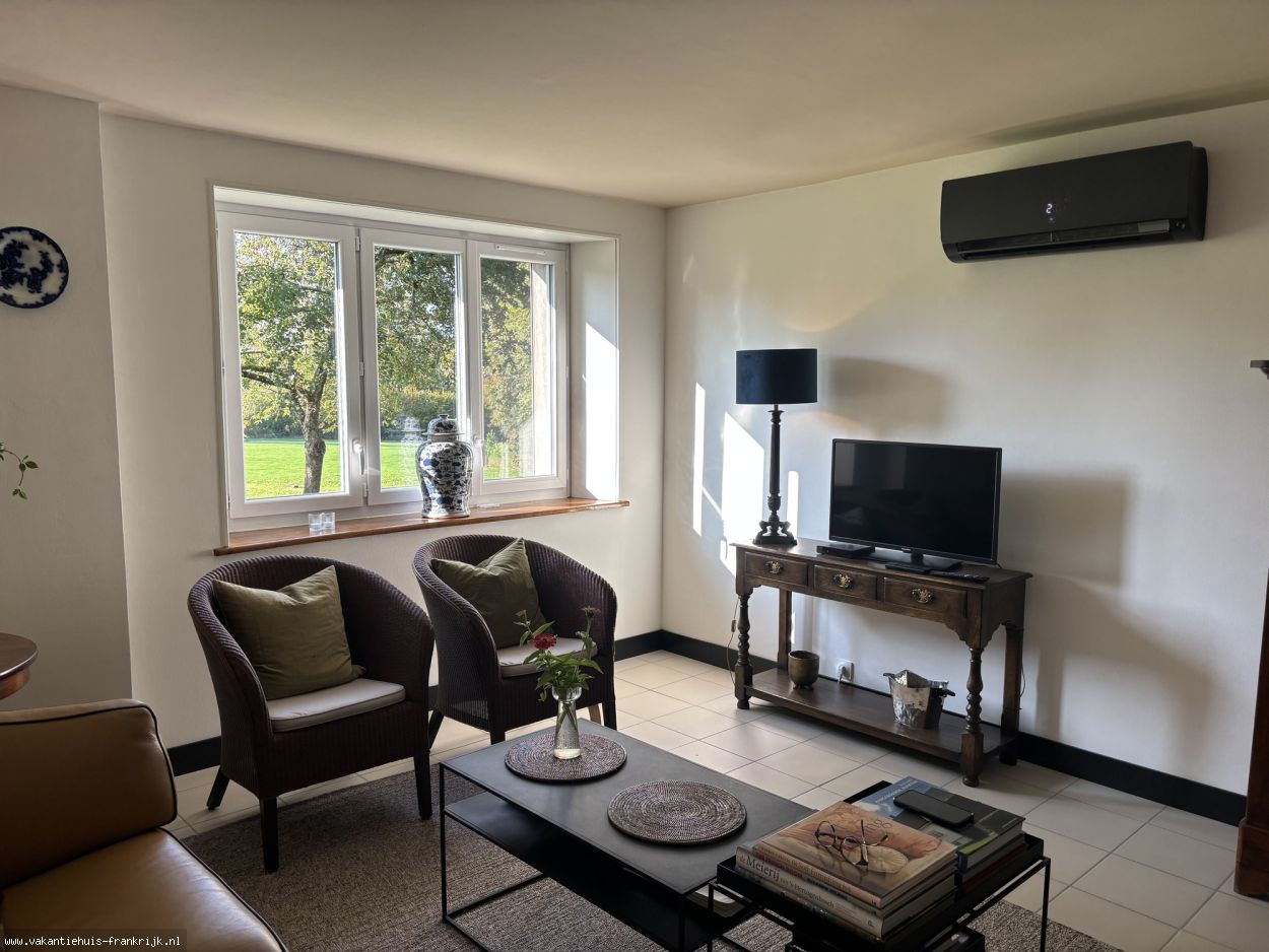 Vanuit de eetkamer komt u in de zitkamer, eveneens voorzien van een airco (koeling/verwarming) en een groot raam met prachtig uitzicht over het eigen weiland.
