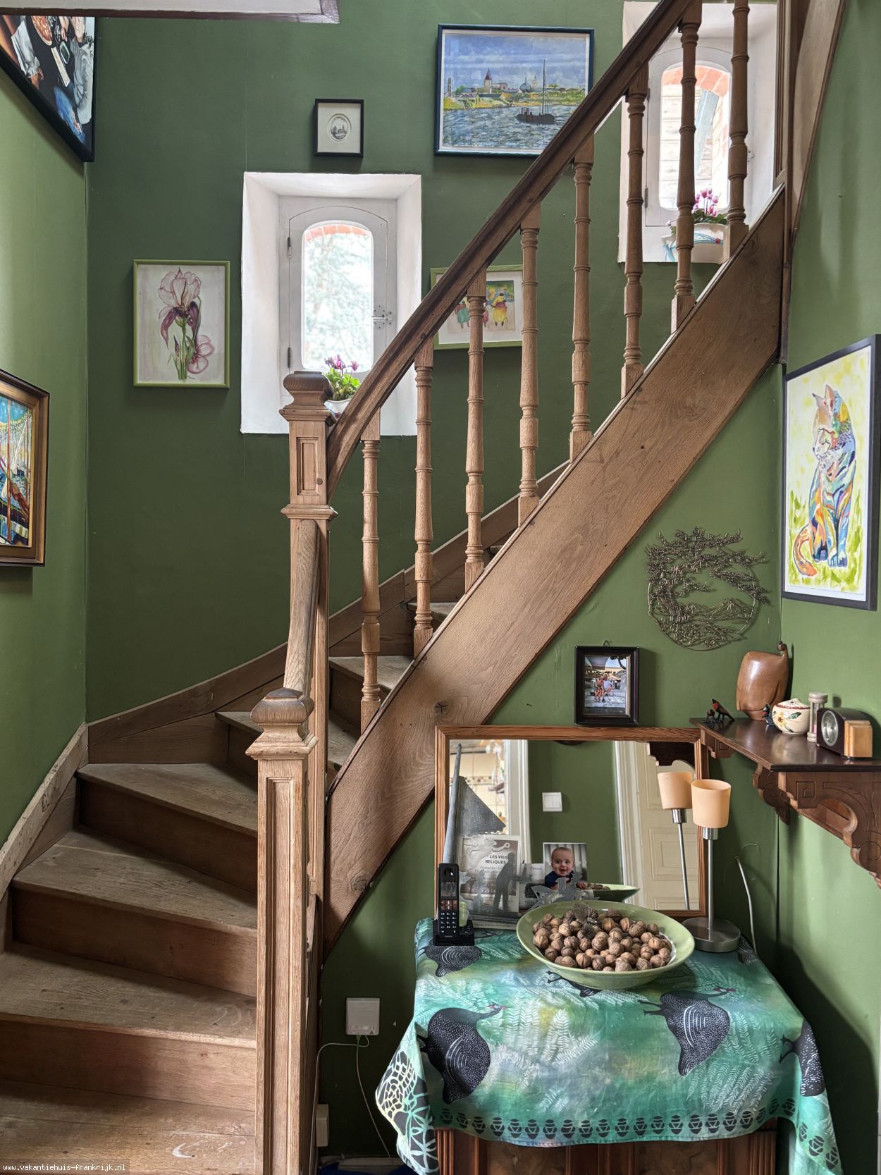 Binnenkomst in de hal met een authentieke tegelvloer en een mooie eikenhouten trap naar de bovenverdieping.