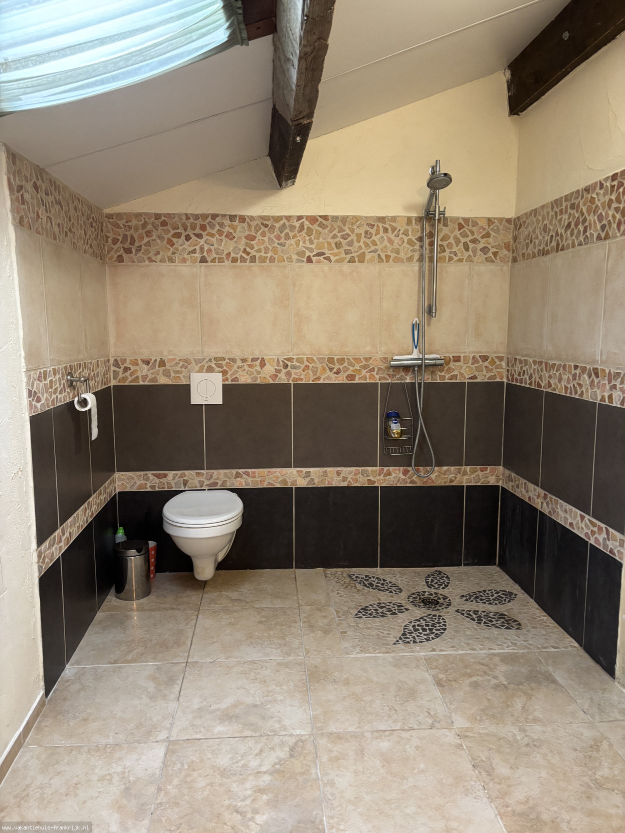 Naast de keuken bevindt zich een badkamer met toilet, wastafel, open douche en warmwaterboiler. Dit bijgebouw biedt volop mogelijkheden als gastenverblijf of verhuurobject.