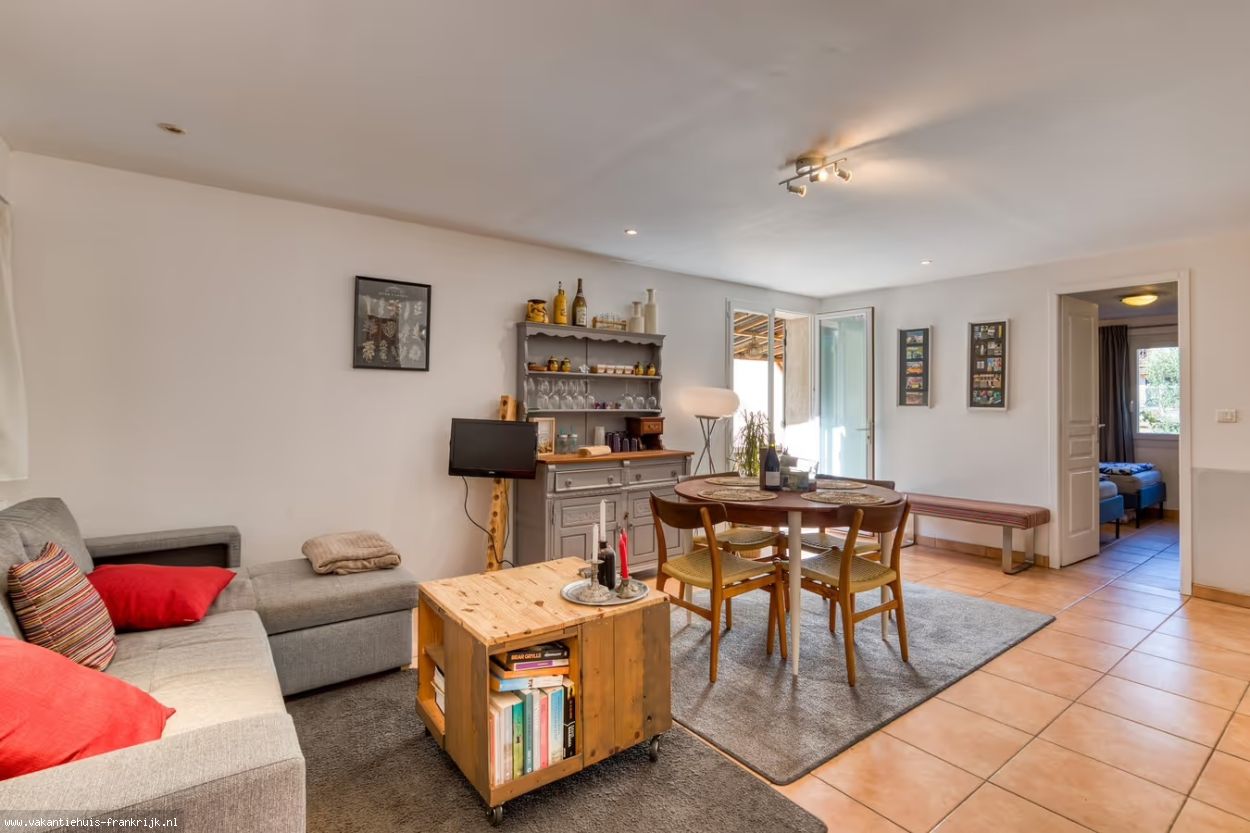 Onze volledig ingerichte gîte bestaat uit een lounge/woonkamer/keuken grenzend aan de tuin met eigen zwembad (8*4), twee tweepersoonskamers, elk met een eigen badkamer en toilet.