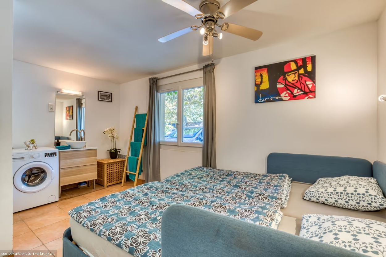 Een slaapkamer met twee eenpersoonsbedden, badkamer met bad/douche en toilet, wasmachine.