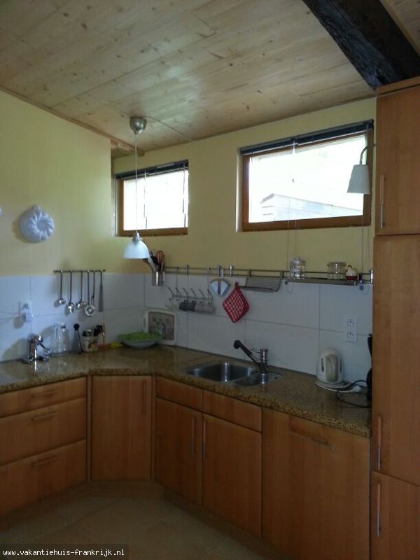 De volledig ingerichte keuken is voorzien van een vaatwasser, oven, 4 pits elektrisch fornuis, koelkast met vriesvak, koffiezetapparaat, waterkoker en airco.