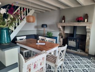 Aan de andere kant van het huis bevindt zich de woonkamer met indrukwekkende oude balken en een grote zandstenen schouw. De ruimte is ingericht met een comfortabele zithoek met televisie. Een grote tafel leent zich voor chic dineren maar er kan ook prima aan geknutseld worden.
