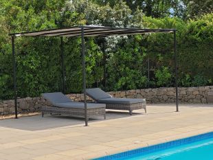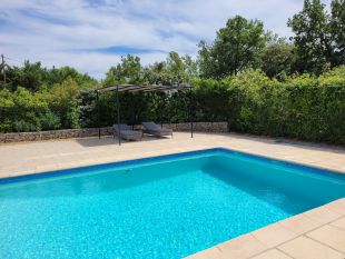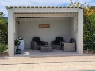 Naast het zwembad kunnen de huurders zonnebaden op het grote terras, of de schaduw opzoeken onder de pergola.