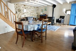 De woonkamer-eetkeuken is riant en sfeervol, voorzien van o.a. een nieuwe pelletkachel en een gezellig zitgedeelte met Nederlandse satelliet tv en WiFi. De bank kan eveneens dienen als tweepersoonsbed. Verder staat er een goedgevulde bibliotheek en allerlei gezelschapsspellen.