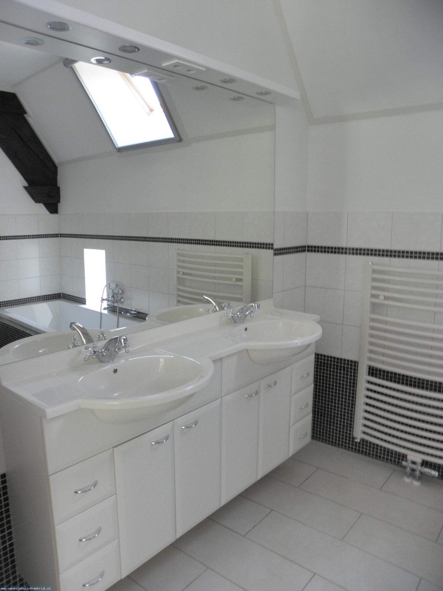 De aangename luxe badkamer heeft een bubbelbad, aparte douche en dubbele wastafels.