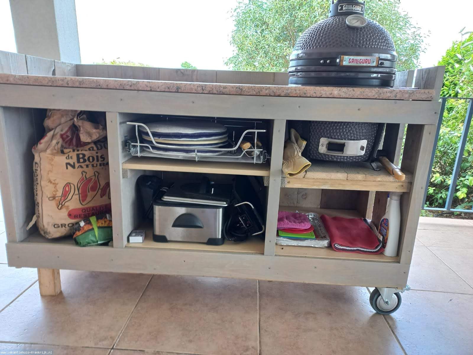 Op dit terras is een verrijdbare buitenkeuken met frituur, bakplaat en een BBQ.
