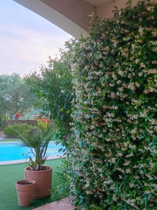 Aan de living bevindt zich een gezellig overdekt terras. Naast het zwembad ligt de buitenkeuken met bar, plancha, gootsteen en koelkast. Het zwembad (kidney vorm) heeft een plage ( een onderwater zitbank) en massage stralen. In de tuin veel gezellige plekjes om lekker een boek te lezen.