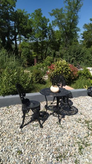 Aan de woonkamer ligt een fijn gezellig terras ( met schaduw in de zomer) met lounge set.