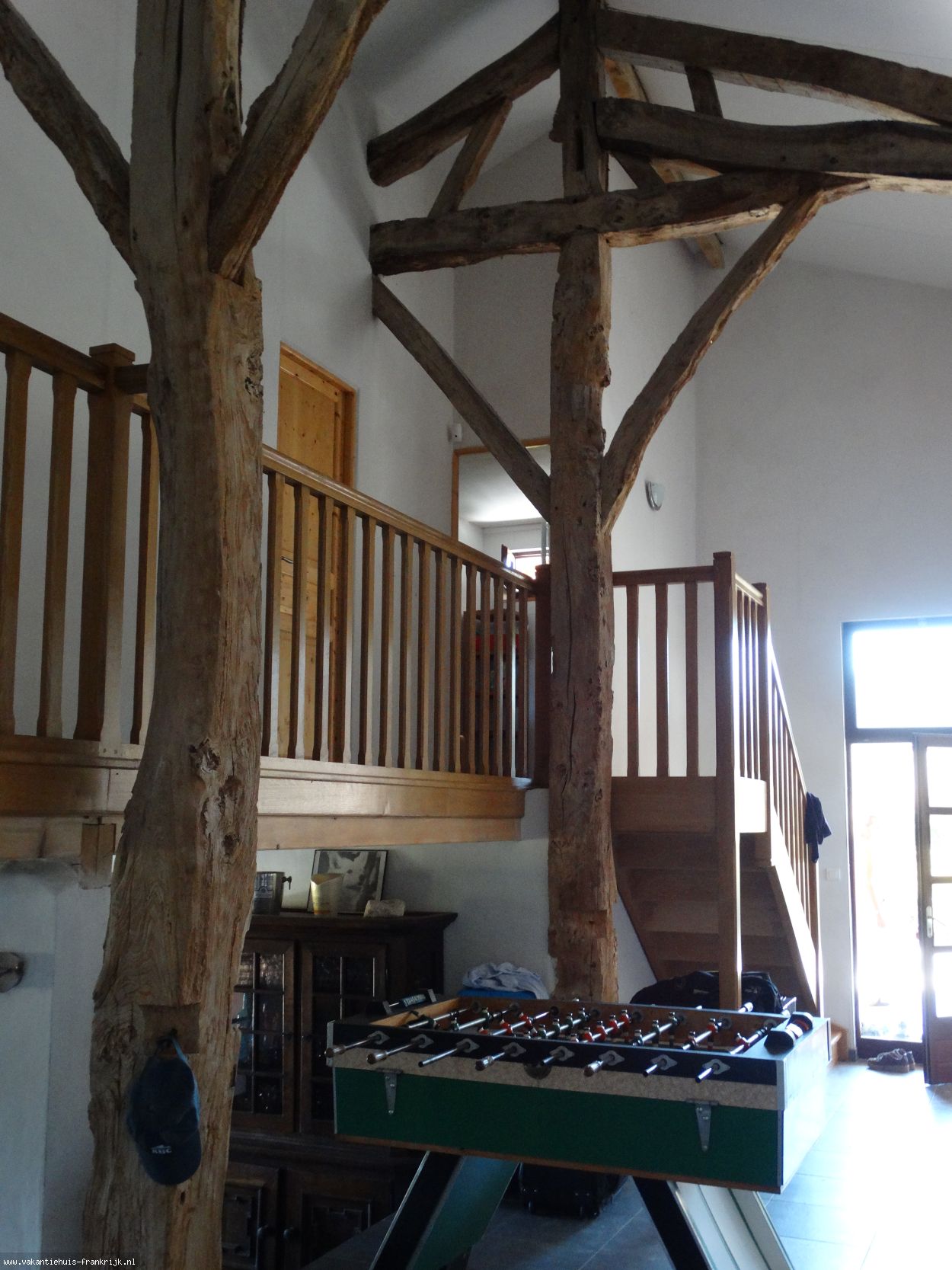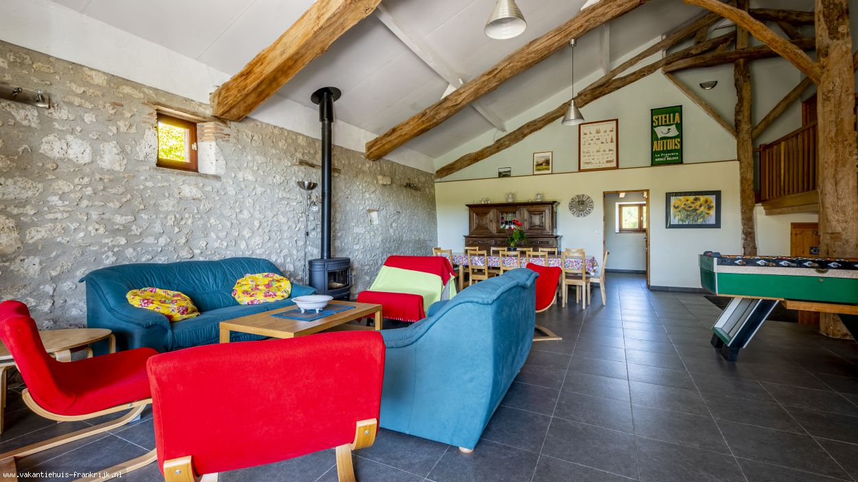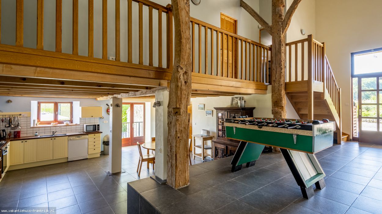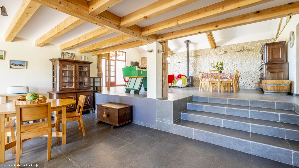 Het interieur van de woning Grange is comfortabel en stijlvol. Via het ruime overdekte terras komt u in het woongedeelte van het vakantiehuis met hoog balken-plafond en natuurstenen muren. Hierdoor is het zelfs tijdens de warmste vakantiedag lekker koel binnen. Ruime open zithoek met DVD, TV (HDMI kabel is voorzien, zodat je met je laptop je favoriete thuisprogramma's kan bekijken), stereo (radio/cd) en eethoek. Via een brede trap kom je in de halfopen keuken (ook bereikbaar via het oostelijk aangelegen terras), stenen vloer, bijkomende eettafel, inductie vuur met 6 kookplaten, oven, afwasmachine, grote koelkast met diepvriescombinatie. Een kleinere koelkast is nog beschikbaar in de andere hoek van de keuken .Aanliggend een aparte stockageruimte..