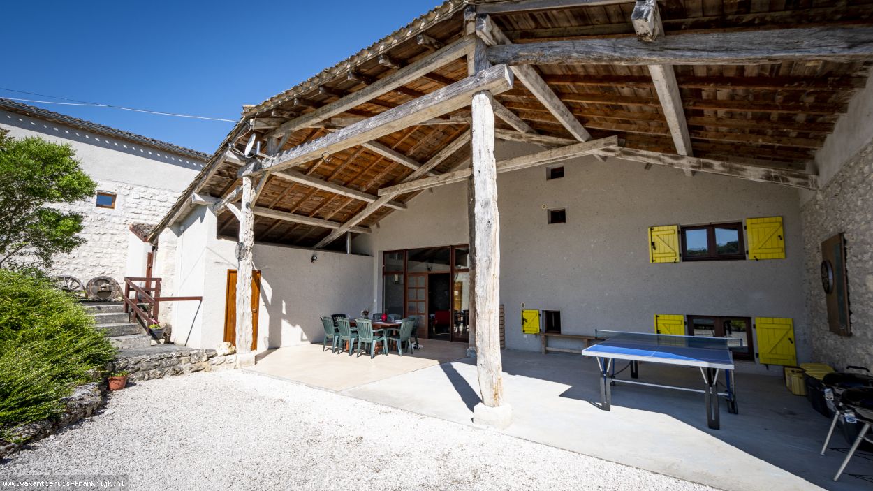 De ingang van de gîte Tournesol is op het overdekte terras en aan de zijde heb je zicht op het zwembad. Door de natuurstenen muren blijft alles lekker koel tijdens een warme vakantiedag.