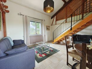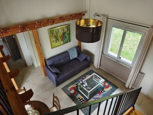 Ruime 4 persoons gite met weids uitzicht over de omliggende weilanden en een grote tuin met zwembad. Het bestaat uit een gezellige woonkamer met zithoek, tv, eethoek met uitzicht op het terras en een halfopen keuken met kookplaat, afzuigkap, oven, magnetron, wasmachine en koel-vries combinatie. Apart toilet. Op de verdieping met mezaninne zijn twee slaapkamers met tweepersoonsbed en een badkamer met inloopdouche en wastafel. Voor de woning is een groot terras met tuinmeubelen. Parkeren op eigen terrein.De omgeving van deze vakantiewoning