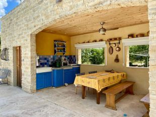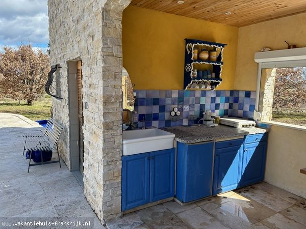 Naast het zwembad (10 x 4 meter en 1.50 diep) een fijne buitenkeuken met douche en toilet, wastafel, gaspit, magnetron en gasbarbecue.