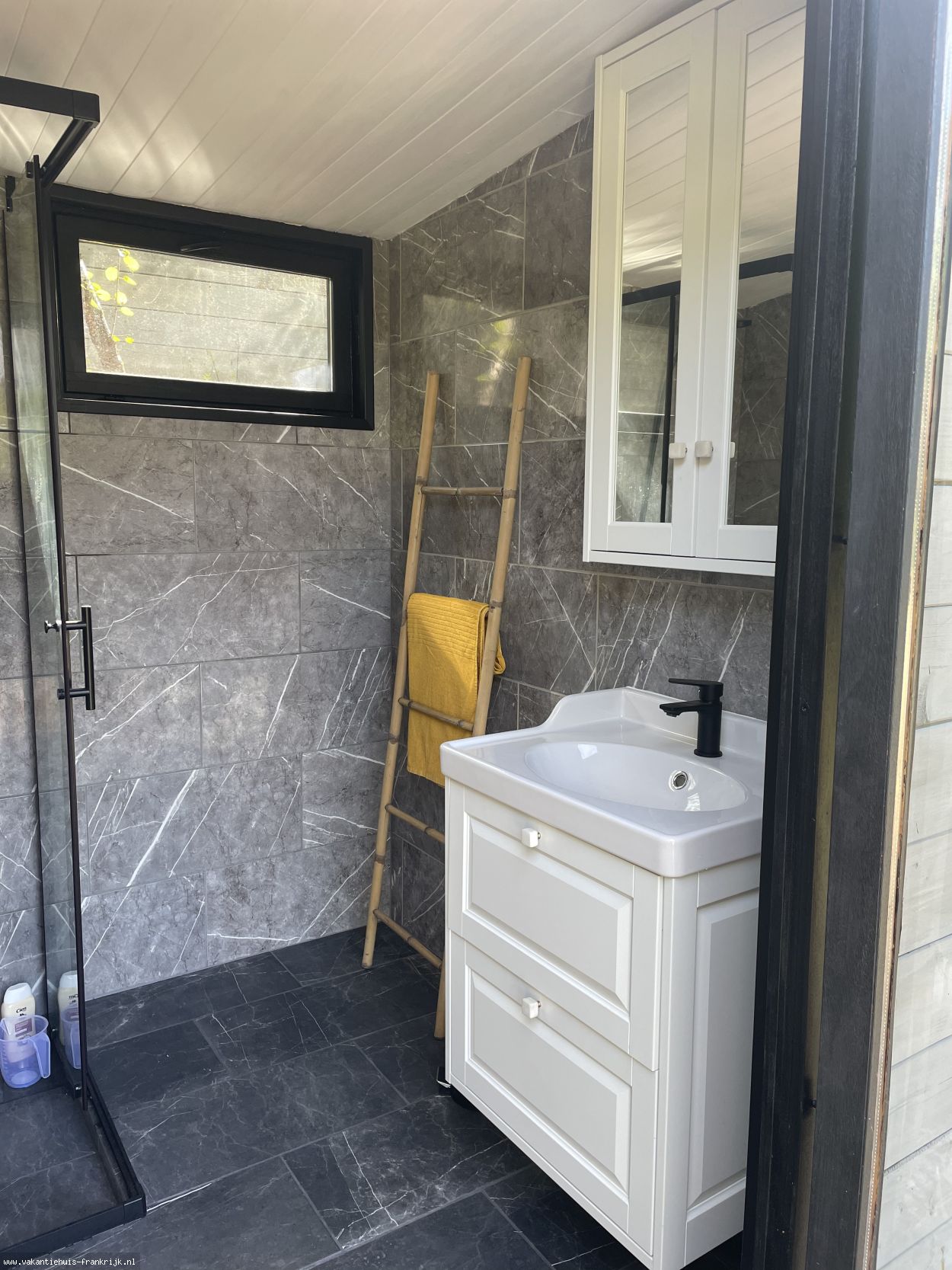 Het slaap gedeelte, geschikt voor 2 personen beschikt over een 2 persoonsbed met 2 losse matrassen ( medium hard) en 2 1 persoons dekbedden, en 2 kussens, alles van natuurlijke materialen .Hier vind u ook genoeg kastruimte voor uw kleding. In de tuin direct naast het huisje hebben wij het prachtige douche huisje gebouwd. Hier is een grote douche, ruim wasmeubel en eco toilet te vinden .