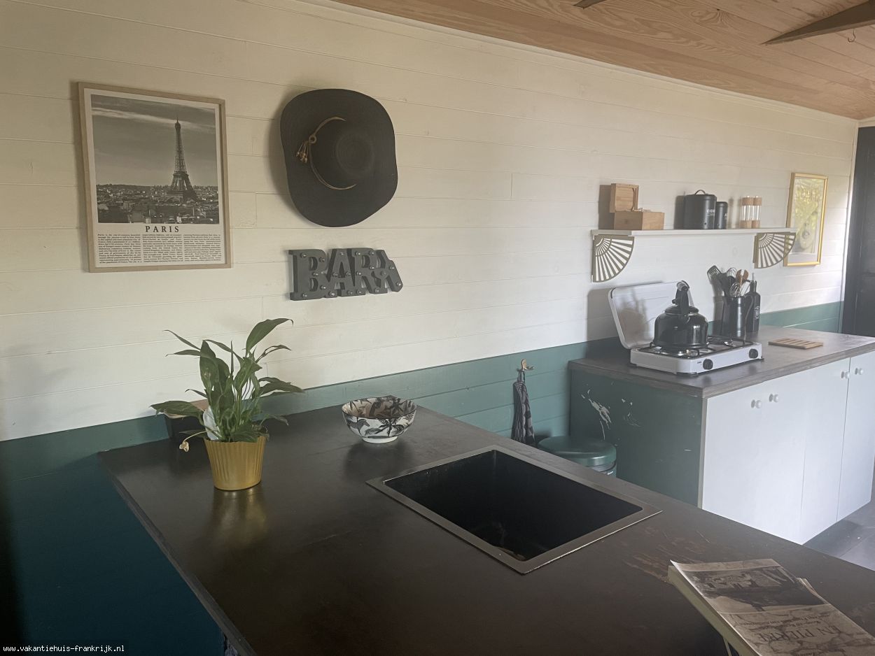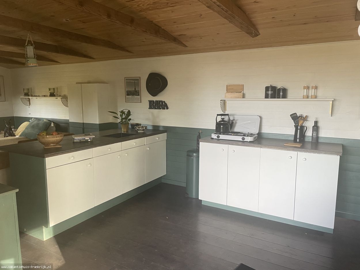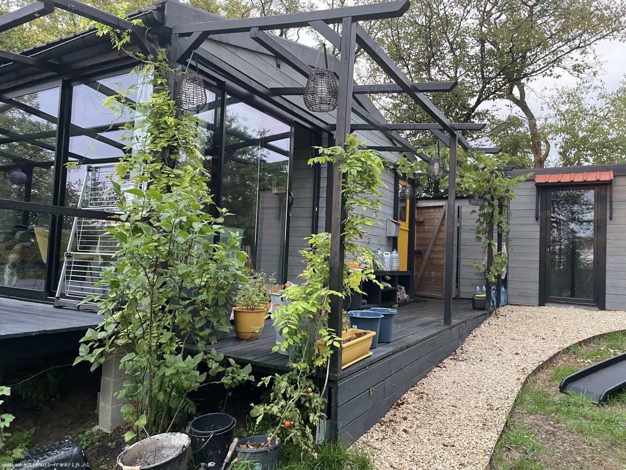 U komt binnen in ons huisje via de glazen veranda. Hier vind u de eettafel, buffetkast en de heerlijke loungebank met tafel. Vanuit deze ruimte die tevens ook te openen is heeft u uitzicht over de tuin en de rivier. Verder vind u binnen de ruime keuken met barretje en een completen keuken uitzet.