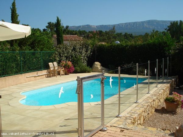 De vrijstaande villa (inhoud 117m2) met zwembad is gelegen op een practige plek met vrij uitzicht op het Massif de la St.Baume. Het totale grondoppervlak is ong. 629 m2.