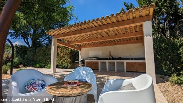 Naast het zwembad is een buitenkeuken met een tweede buiten - eettafel. In de buitenkeuken een barbecue en een plancha.