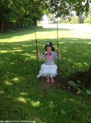 Een groot grasveld met badmintonnet, schommels, picknicktafel en een jeu de boulesterrein.