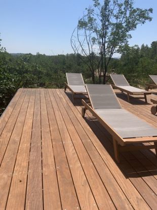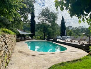 Een trap brengt u bij het lager gelegen zwembad en het gastenverblijf. Het zwembad meet 5 x 11 meter en op het houten zonneterras staan ligbedden voor u klaar. aan het zwembad is een barretje met koelkast.