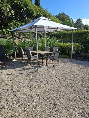 Onder de 2 terrasoverkappingen kunt u lekker uit de zon zitten onder het genot van een glaasje wijn of uw ontbijt of lunch gebruiken.