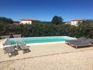 Op het terrein bevindt zich een privé zwembad van 3,5 x 7 meter, met een ruim betegeld terras met diverse ligbedden, ligstoelen met kussens en tafel .