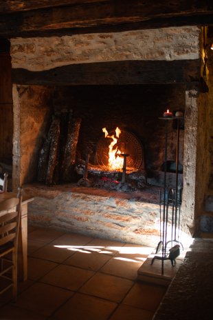 De authentieke woonkamer beschikt over een grote stahoge openhaard. Met name in het voor- en najaar een heerlijke plek om voor te zitten met boek of lekker glas wijn. In de kamer staat een TV met Nederlandse zenders (via satelliet-ontvanger), een Bluetooth aansluiting voor de muziekliefhebber.
