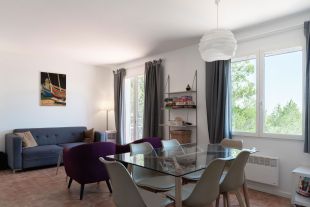Lichte, gezellige woonkamer en eetkamer met openslaande deuren naar het terras