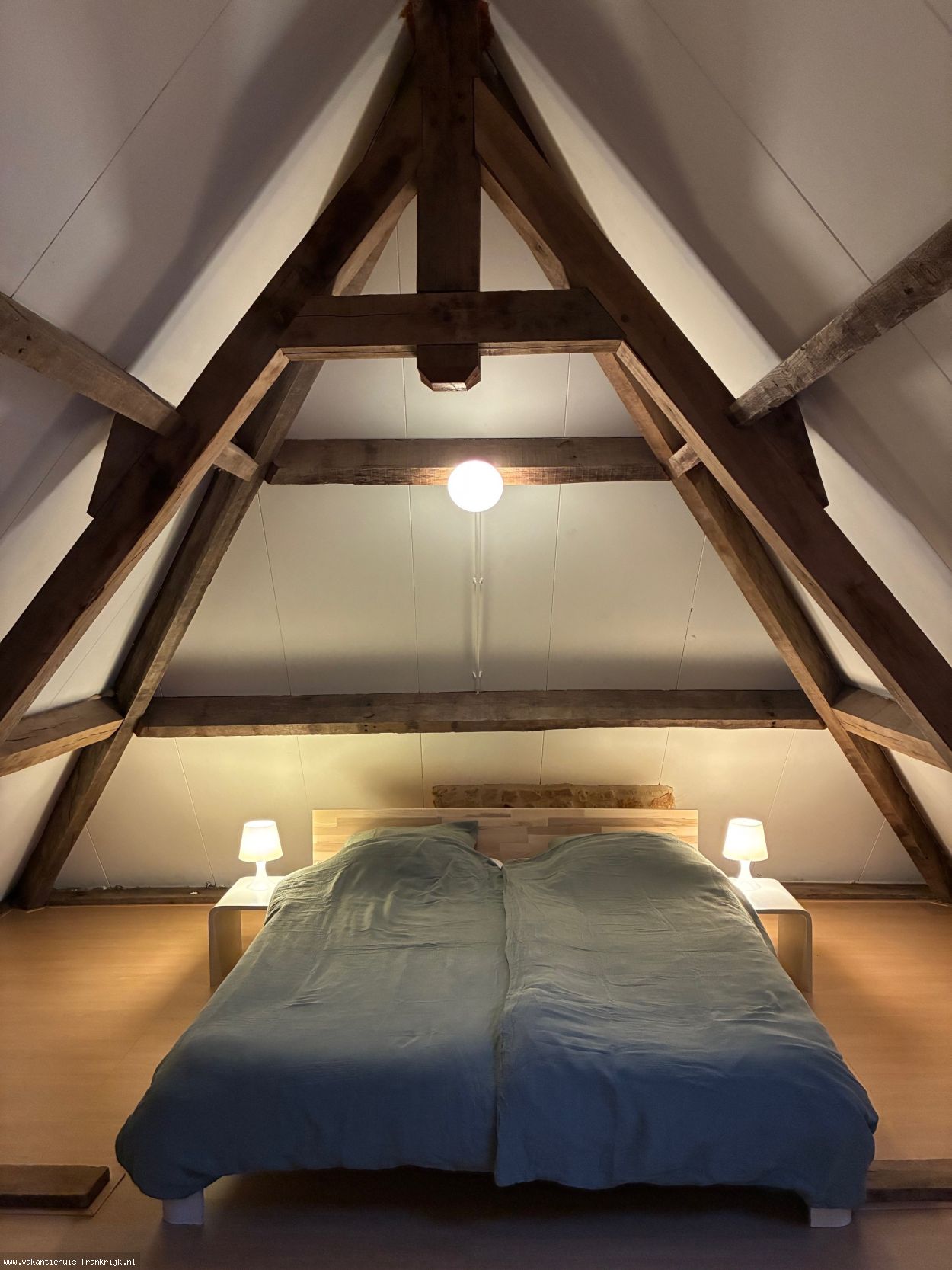 Vanaf de trap in de woonkamer komt u op de zolderverdieping met hierin twee gescheiden slaapvertrekken. U slaapt onder de rustieke eikenhouten dakspanten. Er zijn 2 tweepersoons bedden met losse matrassen. Er is een opvouwbaar kinderbedje aanwezig.