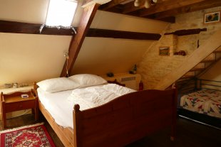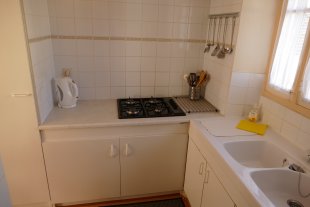 Via een voordeur en een trap bereik je de eerste verdieping. Daar bevinden zich de wc, de woonkamer met heerlijk grote, openslaande ramen (en sinds kort ook met wifi en tv) en een knus keukentje met alle belangrijke voorzieningen (gaskookplaat, koelkast, senseo-apparaat, koffiezetapparaat, waterkoker en oventje).