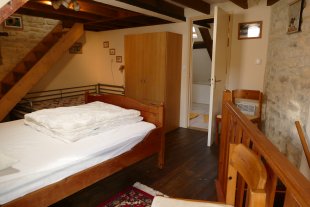Via een trapje en een deur in de woonkamer kom je op de trap, die naar de tweede verdieping leidt. Hier bevinden zich de slaapkamer met een tweepersoonsbed en een eenpersoonsbed en kleerkast en daarboven een slaapzolder met vide, waar een tweepersoons matras ligt.