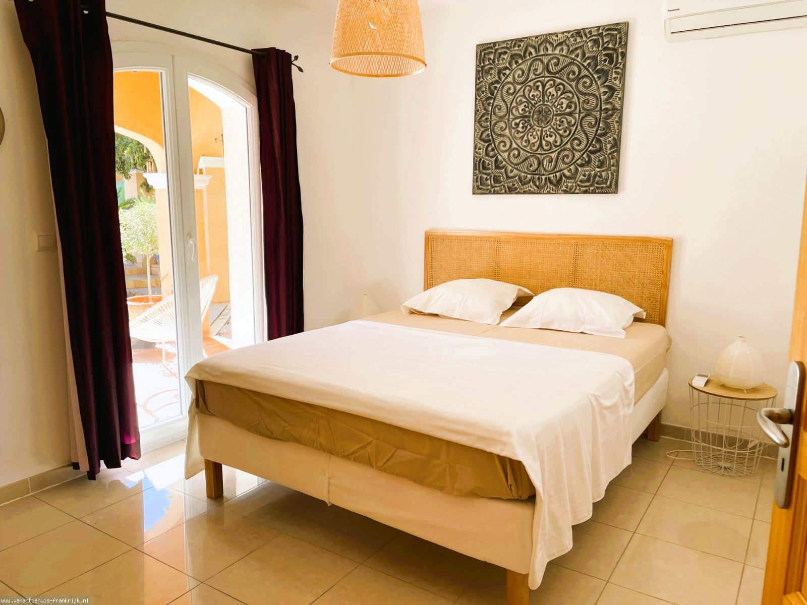 De kamer met uitzicht op de tuin heeft een stapelbed en een vouwbed van 200*90. De andere twee slaapkamers een tweepersoonsbed. De 3 grote slaapkamers zijn voorzien van airco. Er zijn twee badkamers op de begane grond, de een met dubbele wastafel en een douche en de ander met een wastafel, douche en toilet. Tevens is er op de hal ook een apart toilet.