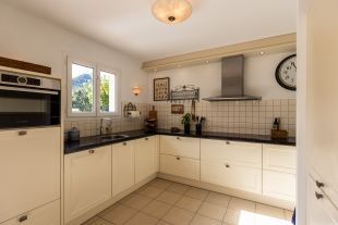 De comfortabele keuken is voorzien van alle apparatuur, zoals een Quooker-kraan, kookplaat, oven, magnetron, vaatwasser, koelkast met vriezer, goede kwaliteit servies- en glaswerk, pannen, ovenschalen, broodplanken, messensets en dergelijke.