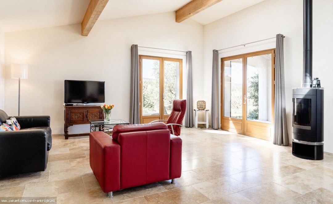 De villa heeft een lichtrijke en sfeervol ingerichte leefruimte van 40 m². De open keuken en woonkamer geven via grote schuiframen direct toegang tot het terras en bieden een prachtig uitzicht op het omliggende landschap.