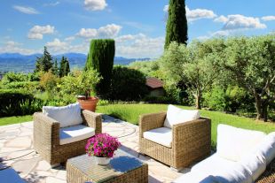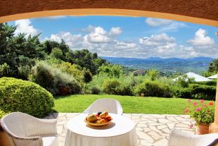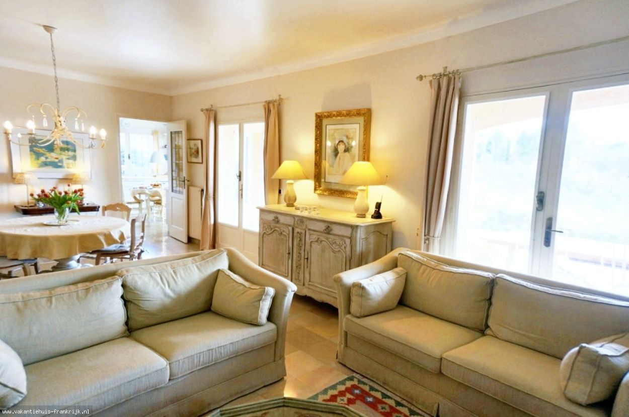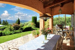 Villa L’Escalet is smaakvol ingericht en de woonkamer heeft grote openslaande deuren, die een prachtig uitzicht bieden op de vallei en het dorp Callian.