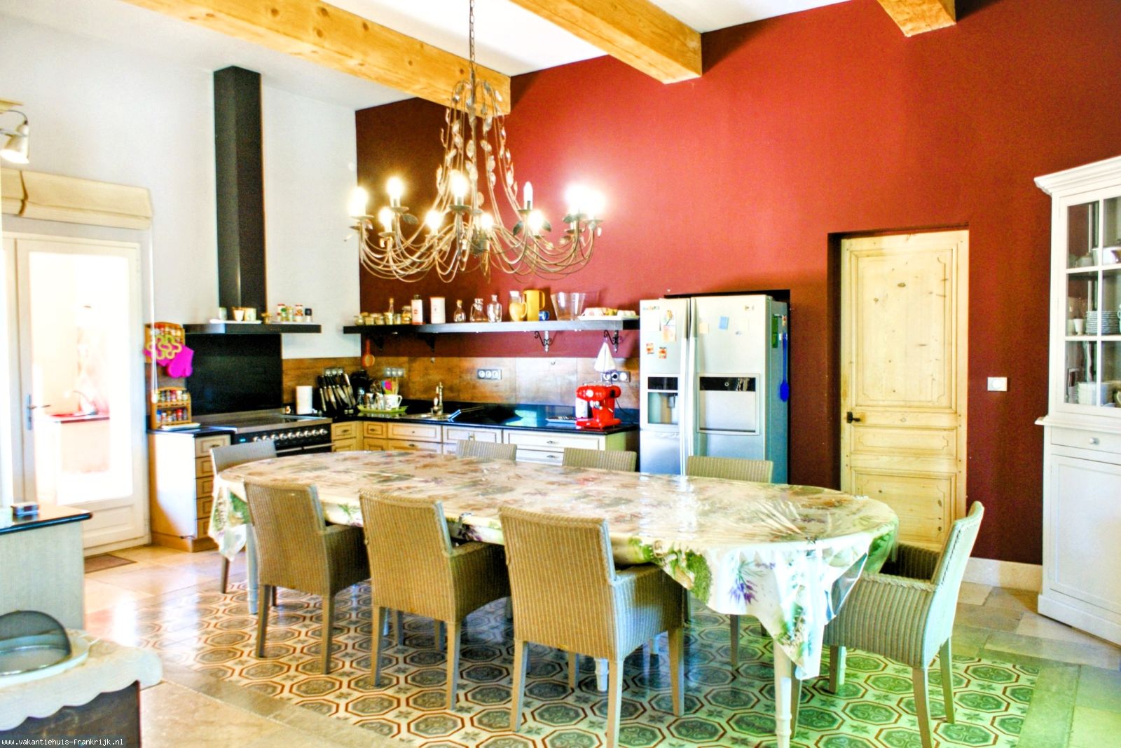 De open keuken vormt het hart van het huis, compleet met een lange eettafel voor 8 personen en hoogwaardige apparatuur: elektrisch fornuis met oven, magnetron, vaatwasser en een ruime koelkast. In de aangrenzende bijkeuken vind je een wasmachine, droger, strijkbenodigdheden en een extra koel-/vriescombinatie.