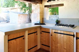 De oppervlakte van de villa is 130m² en bestaat op de gelijkvloerse verdieping uit een gezellige woonkamer met zithoek, tv en houtkachel, openend naar het terras. De houten balken in het plafond voegen extra charme toe. Aaneengesloten is er een eetruimte met eettafel voor 6 personen, ook met kachel, en trap die naar de eerste verdieping leidt. De kachels dienen als decoratie en mogen om veilgheidsredenen niet gebruikt worden. De keuken staat in verbinding met de eetkamer en ook hier is het authentieke karakter bewaard gebleven. Toch is die heel functioneel, met kastruimte, een kookfornuis op gas (4 pitten) en tevens een inductie kookplaat, een microgolf, vaatwasser, koffiemachine (Nespresso en filter), ijsblokmachine, koelkast en diepvries. Alles om met de nodige lokale ingrediënten de beste kok in onszelf naar boven te brengen en ons gezelschap te verrassen met een heerlijke maaltijd.