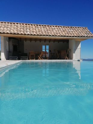 Vanuit het zwembad (10m x 5m) met panoramische overloopsysteem en groot zonneterras, kan u overdag genieten van het prachtige uitzicht over de groene vallei. Op het domein bevinden zich een goed onderhouden olijfgaard in aangroei, een pétanqueplein en een buitenkeuken met barbecue. De Mas is gelegen op een heuvel en vanop de verschillende terrassen met uitzicht op het prachtige natuurschoon is het aangenaam verpozen. Er is voldoende schaduwrijke parkeergelegenheid.