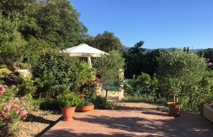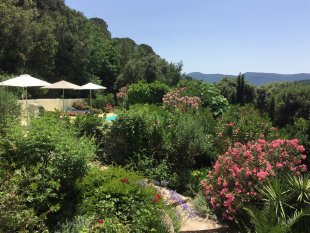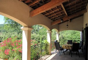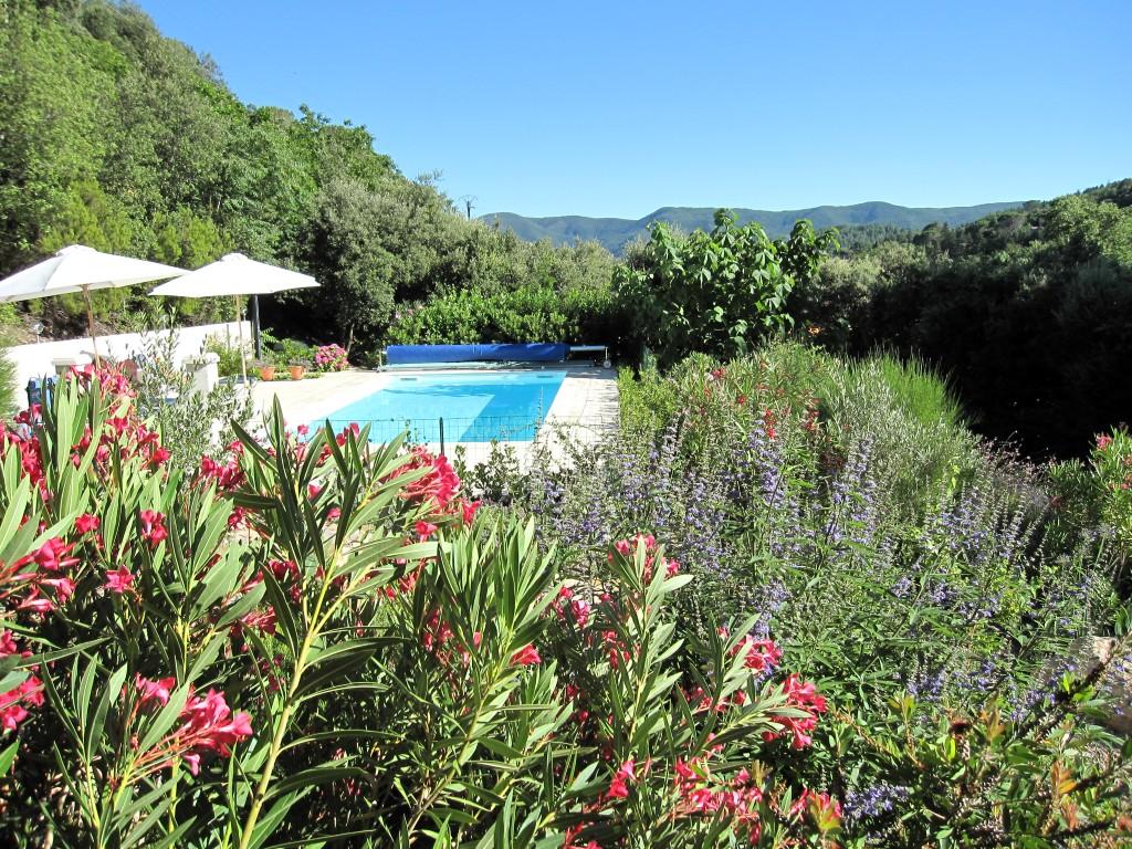In de woonkamer treft u een eethoek en een sfeervolle zithoek bij de Godin-houtkachel. Vanuit de woonkamer heeft u via de openslaande deuren toegang tot een groot overdekt terras en het zonneplateau, waar vanaf u vrij uitzicht heeft op de tuin en het zwembad. In de verte ziet u de bergen van de Orb vallei.