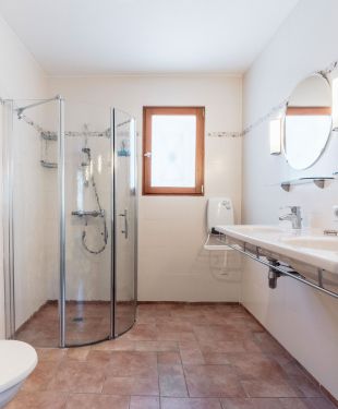 Twee moderne badkamers met inloopdouches, dubbele wastafels en WC